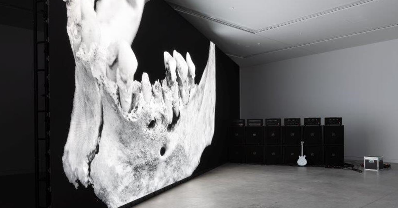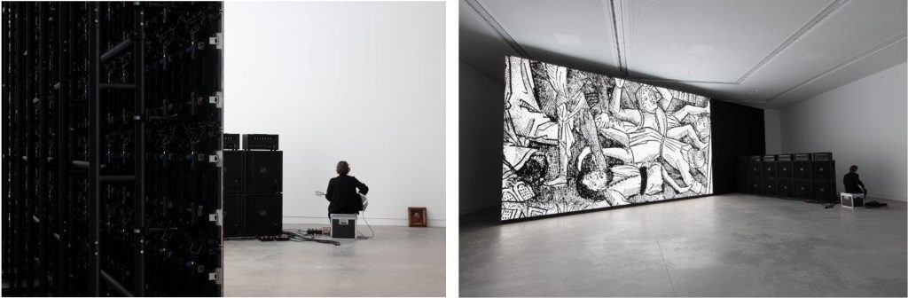 The large-scale, immersive artwork sees Fusinato improvising slabs of noise, saturated feedback and discordant intensities with an electric guitar, triggering a deluge of disparate and disconnected images onto a freestanding floor-to-ceiling LED wall. The pavilion is simultaneously a de facto studio and a space for research where Fusinato can test cause and effect in real time.