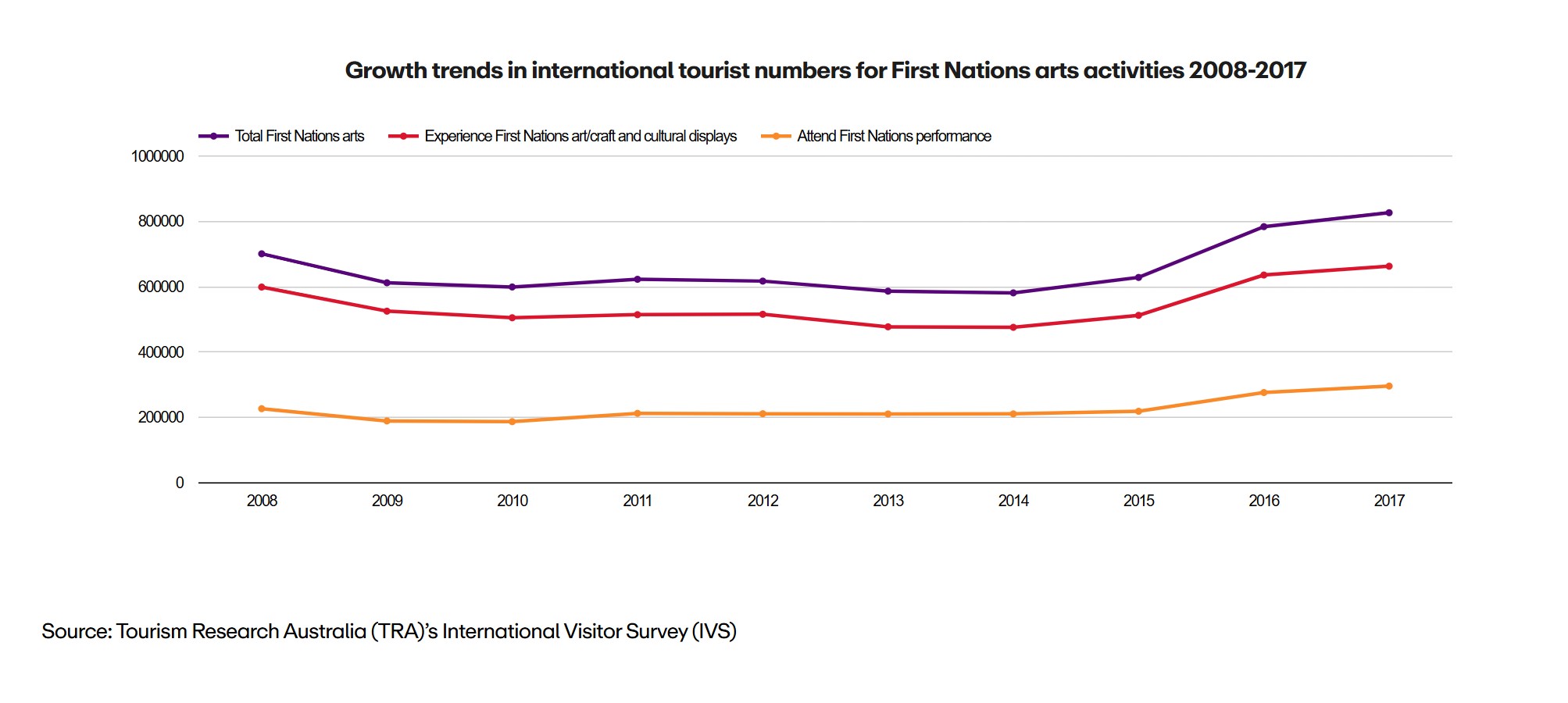 - Over 820,000 international tourists engaged with First Nations arts while in Australia in 2017, an increase of 41% since 2013. This incorporates increased attendance at First Nations performances as well as attendance at art, craft or cultural displays.