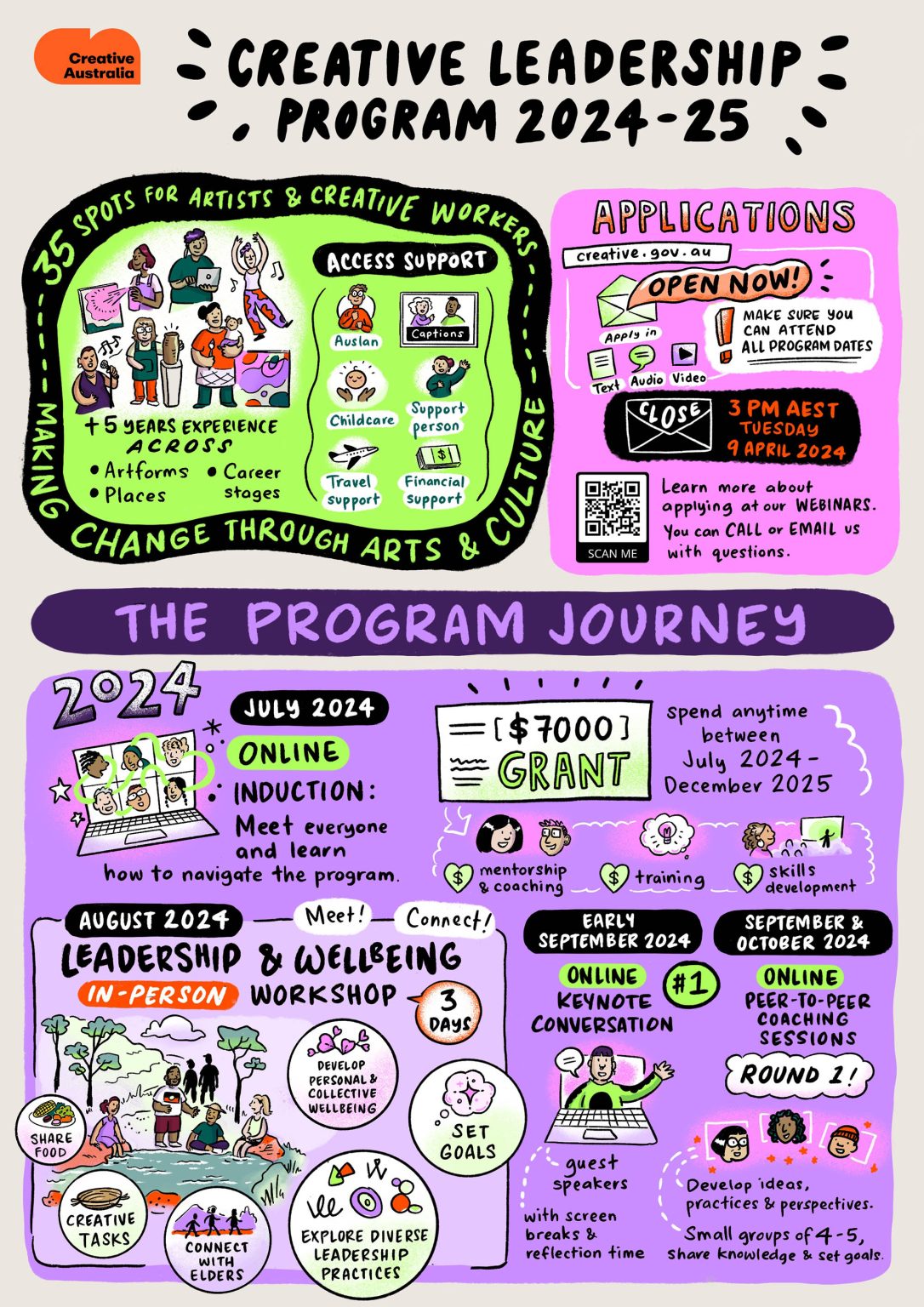 Please contact us if you would like to discuss the support available. Email Adelaide and Emerald from the Leadership Programs team via leadershipprogram@creative.gov.au or you can find a time to chat via our online booking portal.