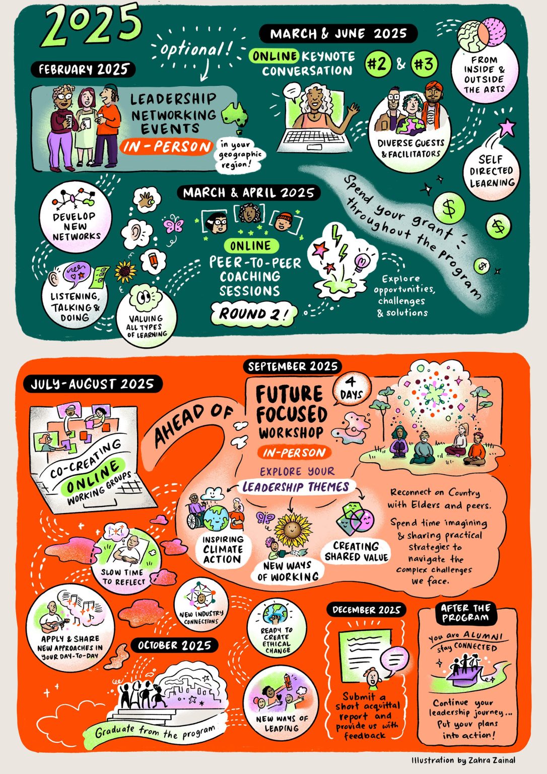 Across the program, participants will engage in-person and online in mentoring, training, workshops, peer-to-peer coaching and conversations. They will spend time on Country learning from First Nations Elders, connect with artists, be guided by experienced facilitators and hear from speakers working across and beyond arts and cultural work.