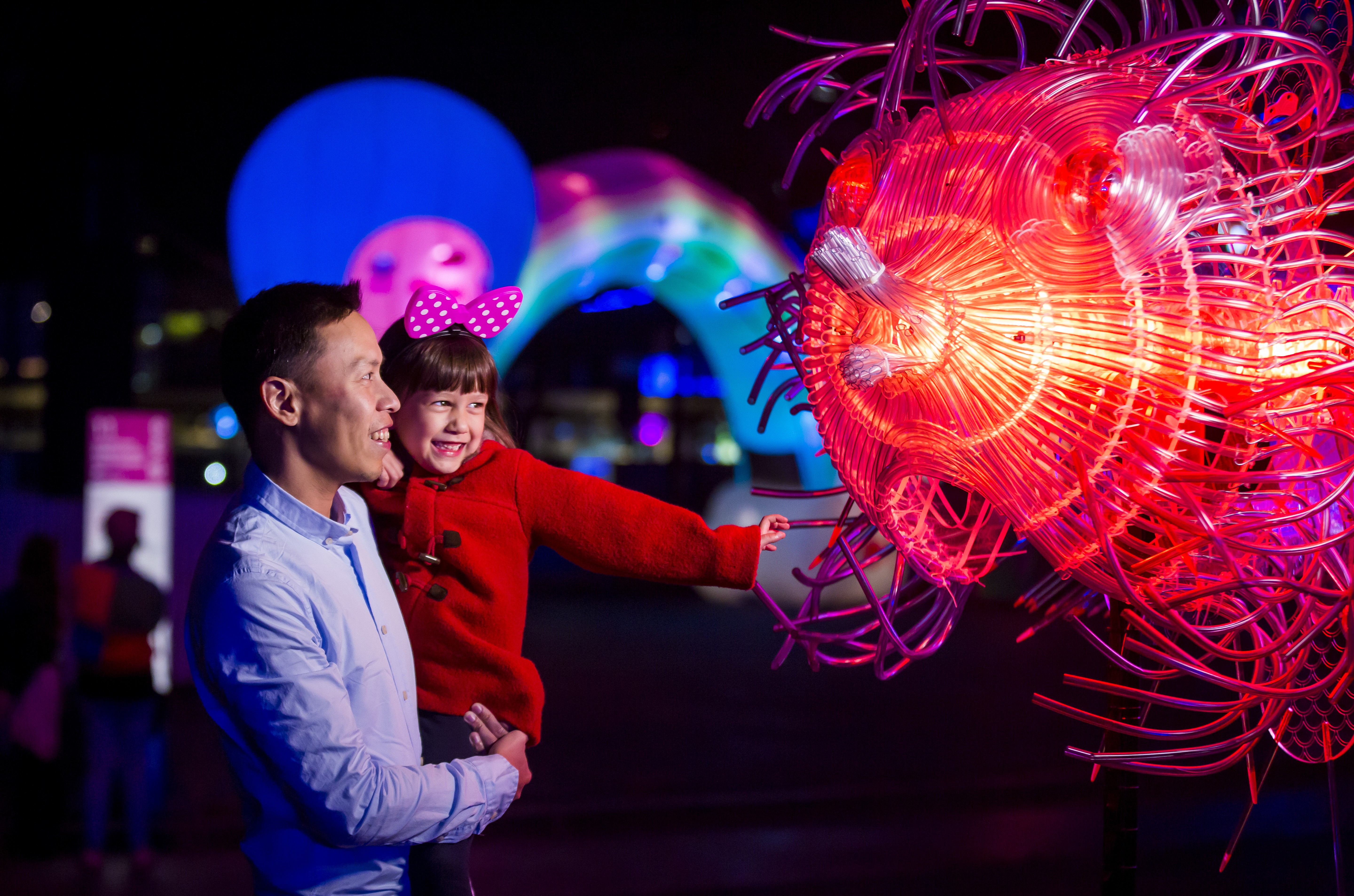Image: Family enjoying a close-up view of the Fugu light installation at First Fleet Park, The Rocks during Vivid Sydney 2018. Credit: Destination NSW