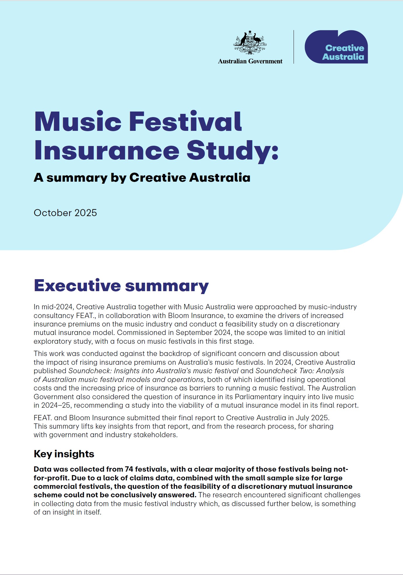 In mid-2024, Creative Australia together with Music Australia were approached by music-industry consultancy FEAT., in collaboration with Bloom Insurance, to conduct a study into the feasibility of a discretionary mutual insurance model for the music industry and examine the drivers of increased insurance premiums. This project was commissioned in September 2024. The scope was limited to an initial exploratory study, with a focus on music festivals in this first stage.