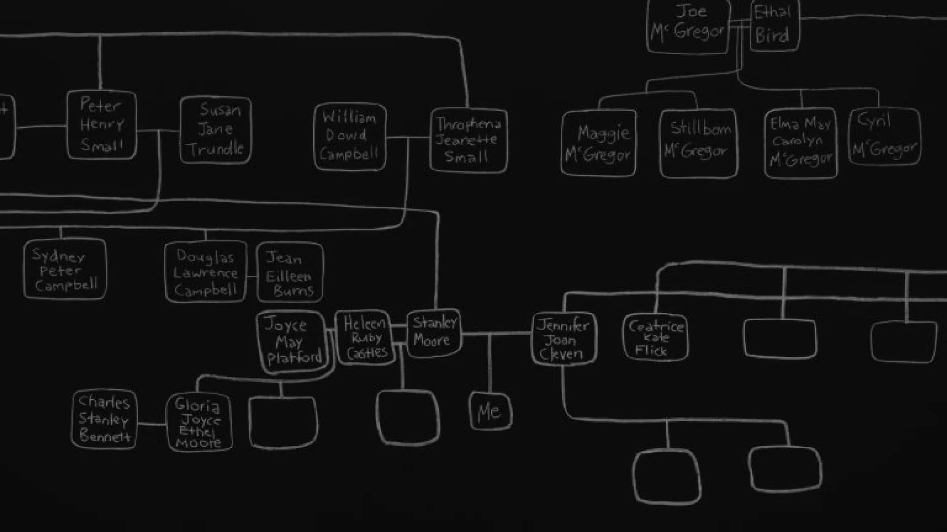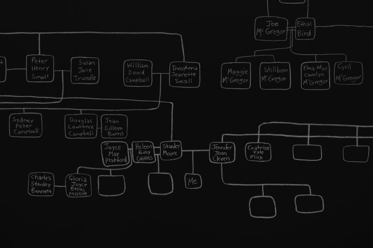 The complexity of First Nations kinship systems exceeds the standard genealogical chart. Archie’s extensive drawing captures the common ancestors of all humans, emphasising our kinship responsibilities to each other. In a Kamilaroi understanding of time, past, present and future are co-present. By placing tens of thousands of years of kin on a single continuum, Archie enfolds audiences within the everywhen.